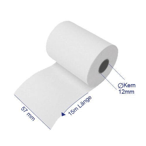 Bei den Thermorollen mit den Maßen 57mm x 15m x 12mm handelt es sich um weiße EC-Rollen aus Thermopapier. Die Rollenwicklung ist gekennzeichnet durch eine Rollenführung, die die Thermobeschichtung nach außen führt. Die Rollenbreite liegt bei 57 Millimeter und die Rollengesamtlänge beträgt 15 Meter. Das Thermopapier ist um eine Kernhülse gewickelt, welche einen Durchmesser von 12 Millimeter aufweist. Diese Faktoren bestimmen die Aufnahme in den dafür vorgesehenen Thermodrucker. Kompatibel sind die Thermorollen 57mm x 15m x 12mm für sämtliche externen oder integrierten Thermodrucker oder auch EC-Cashdruckern, die diesen Maßen entsprechen. Die Rückseite des Thermopapiers ist nicht bedruckt.